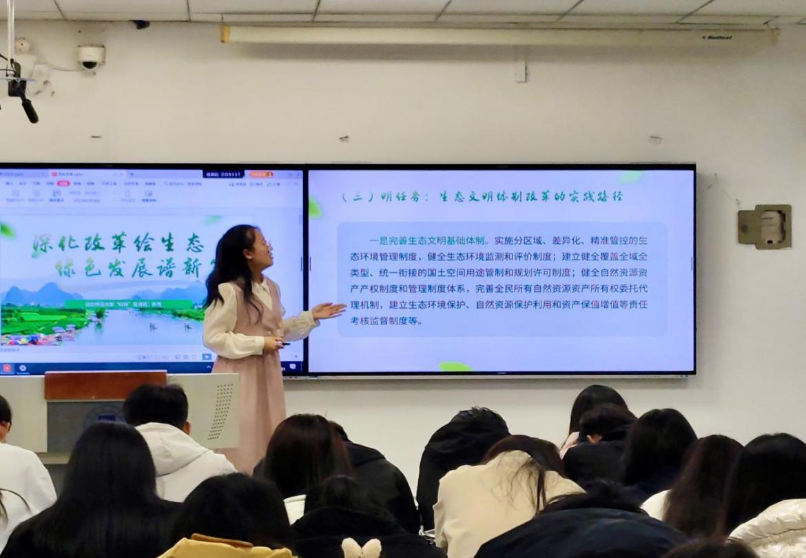 “红砖”宣讲团成员张悦从“生态建设结硕果,美丽中国展新颜”“全会精神领航向,绿色发展启新程”“青年担当筑梦想,生态文明谱新篇”三个方面深刻阐明党的二十届三中全会对生态文明建设的要求和指示。她以浙江安吉余村、河北塞罕坝、四川宜宾为例,带领同学们回顾了美丽中国建设取得的成效,呼吁新时代青年将青春与热血挥洒到构建人与自然和谐发展新格局、推进美丽中国建设的伟大事业之中。